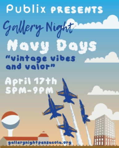 Gallery Night: Navy Days "Vintage Vibes and Valor" - April 17, 5:00–9:00 PM - Monthly downtown art walk with a Navy theme this month — 314 people interested on Facebook, which is a solid Gallery Night number. Multiple galleries along Palafox and downtown. Free to attend.